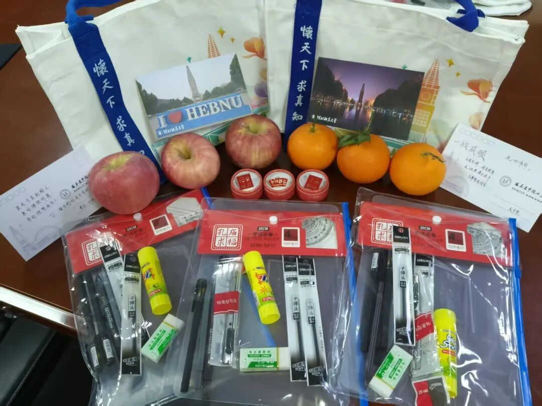 学院班子与老师们将精心准备的“考研助力礼包”亲手送到同学们手中。礼包内有寓意“心想事成”“平安上岸”的橙子和苹果,有考试专用的文具套装,还有学院老师们为同学们手写的寄语卡片,每一份礼物都承载着学院对考研学子的细致关怀与美好祝愿。