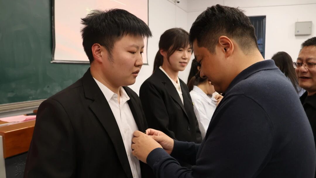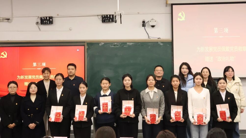 活动现场,与会教师党员为新发展党员佩戴党员徽章、赠送“政治礼物”。